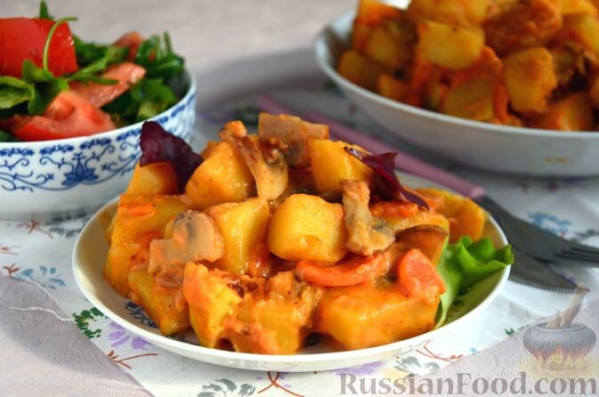 - Картошка с грибами в сметанно-томатном соусе: Обжаренные шампиньоны и лук тушатся с картофелем в нежном соусе, придающем блюду легкую кислинку.