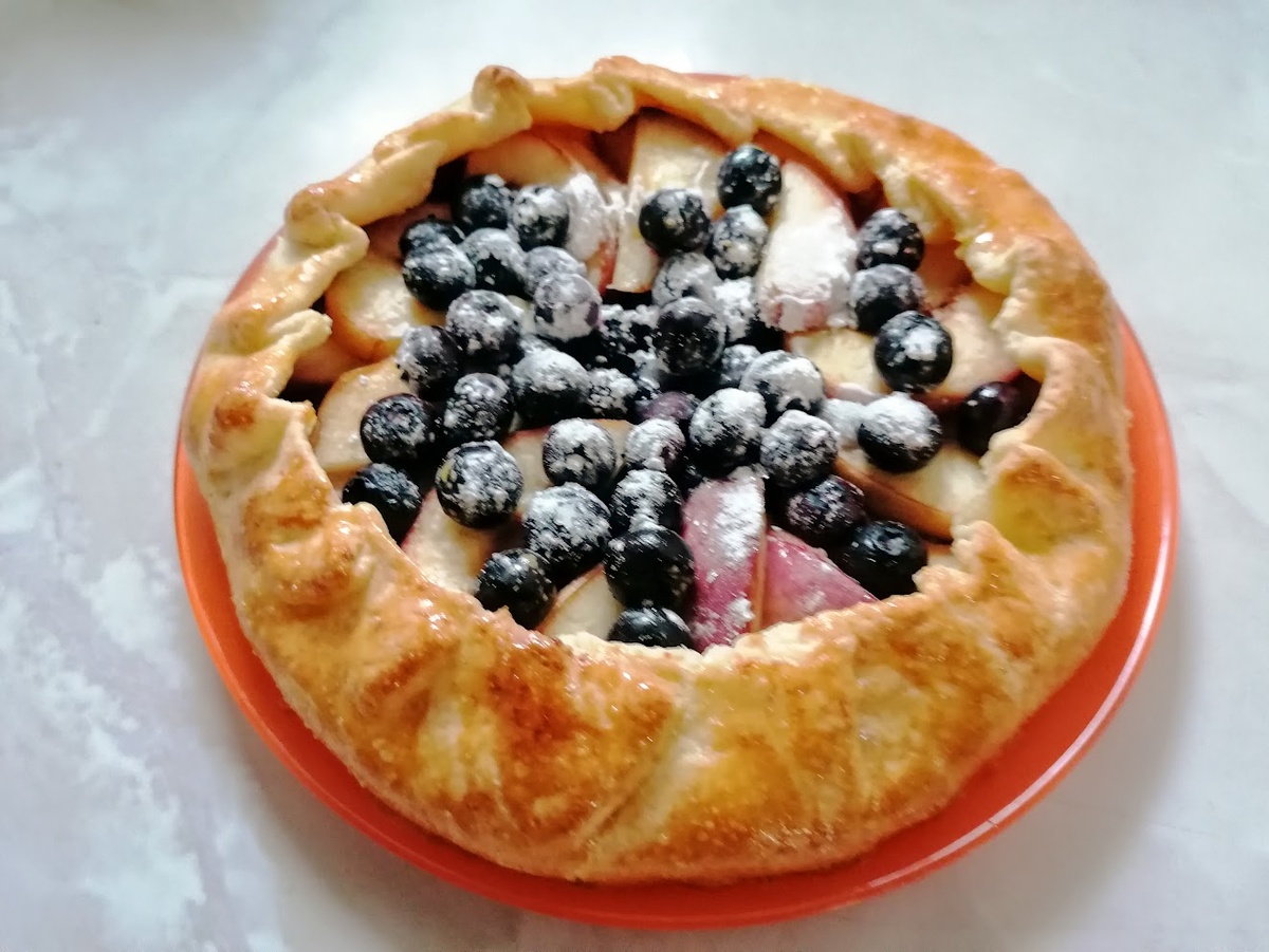 Ягоды и фрукты следует промыть, обсушить и нарезать. Нектарины можно оставить дольками, а голубику просто добавить в начинку. После этого раскатайте тесто в два круга и сформируйте галету, смазывая края яичным желтком для золотистой корочки.