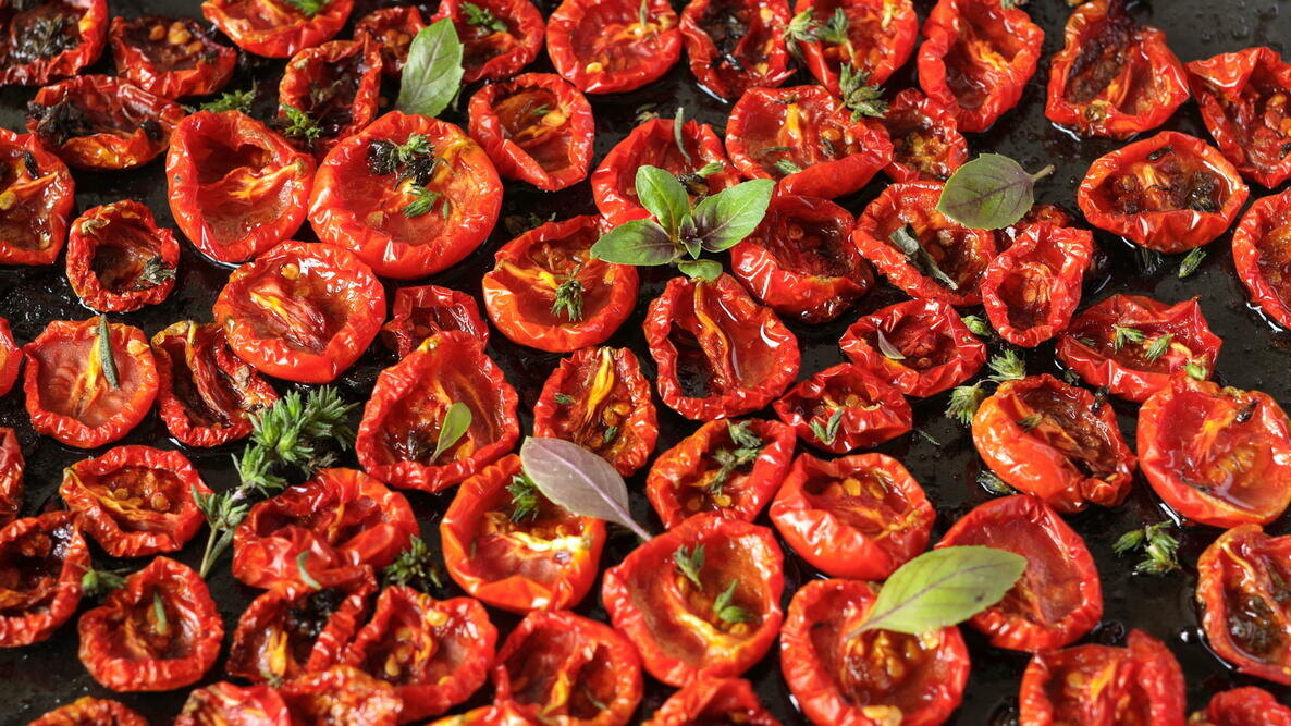 Сушёные помидоры идеально подходят как приправы и могут добавляться в различные блюда, так как они долго хранятся и имеют низкую калорийность. Для этого лучше выбирать сливовидные сорта с тонкой кожицей.