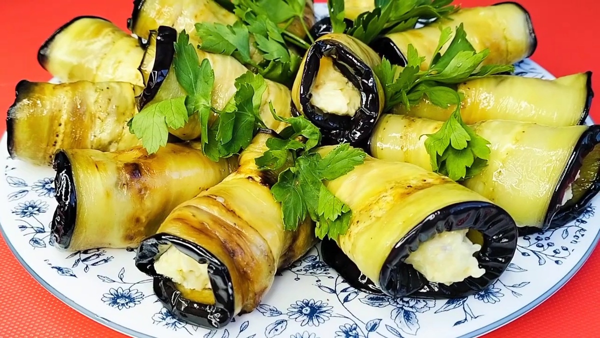 На каждую пластинку баклажана выкладывайте начинку, сверните в аккуратные рулетики. Эти лакомства можно подавать сразу или подождать немного, чтобы они охладились в холодильнике — на следующий день они станут еще вкуснее!
