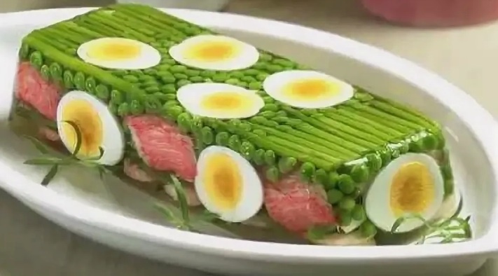 - Украшения: Разложите зелень, лимоны, горошек или другие овощи на дно форм перед заливкой.