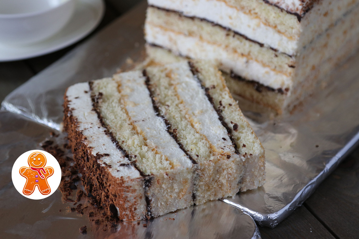 4. **Сборка торта**: Разрезать бисквит на три коржа, пропитать их сахарной смесью с коньяком. Один из коржей смазать шоколадной массой, охладить до застывания. На остальные коржи нанести крем, складывая их в стопку.