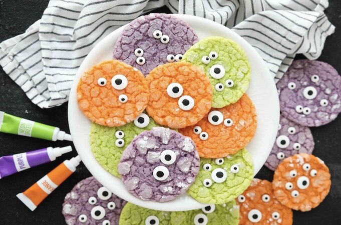 «Хэллоуинские монстрики» — это простейшее угощение для вечеринки. Приготовить его могут даже новички! Достаточно замесить тесто для печенья, добавить немного яркого пищевого красителя, а затем украсить конфетными глазками, чтобы получить обаятельную и в то же время зловещую закуску.