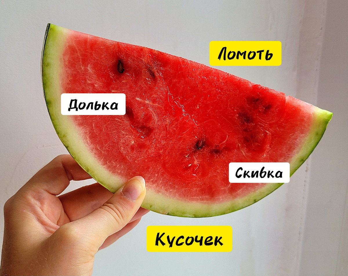 По результатам обсуждений, выделилось шесть основных названий для дольки арбуза: «долька», «кусок», «ломтик», «пласт», «скибка» и просто «арбуз». Вот краткий обзор: