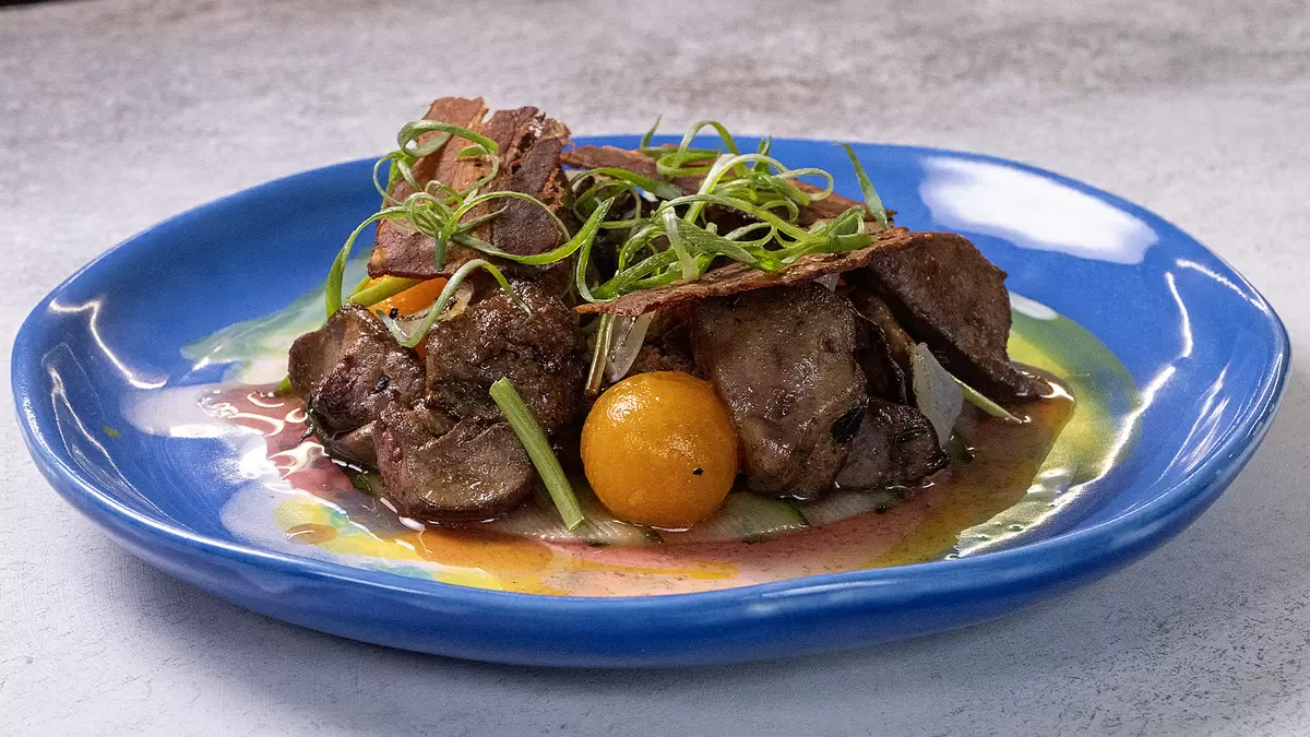 Приступить к подаче блюда можно следующим образом: на тарелку выложить тонкие полоски свежего огурца, затем куриную печень с обжаренным луком. Украсить всё маринованными помидорами черри и кинзой. Для финального акцента можно полить малиновым сиропом и добавить чипсы из бекона. Блюдо готово, и его можно подавать к столу!