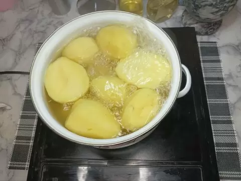 Начинаем с картофеля: очищенные клубни нарезаем средними кусками и помещаем в кастрюлю с водой. Не забудьте посолить по вкусу и поставить на плиту вариться.