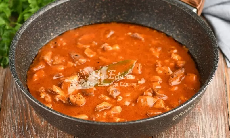 Используйте вместо томатной пасты 3 столовых ложки кетчупа, добавить 3 зубчика чеснока и 1 столовую ложку муки. После этого постепенно влить около 500 мл воды, накрыть крышкой и тушить еще 30-35 минут. Перед подачей приправить зеленью, чтобы завершить это невероятное блюдо.