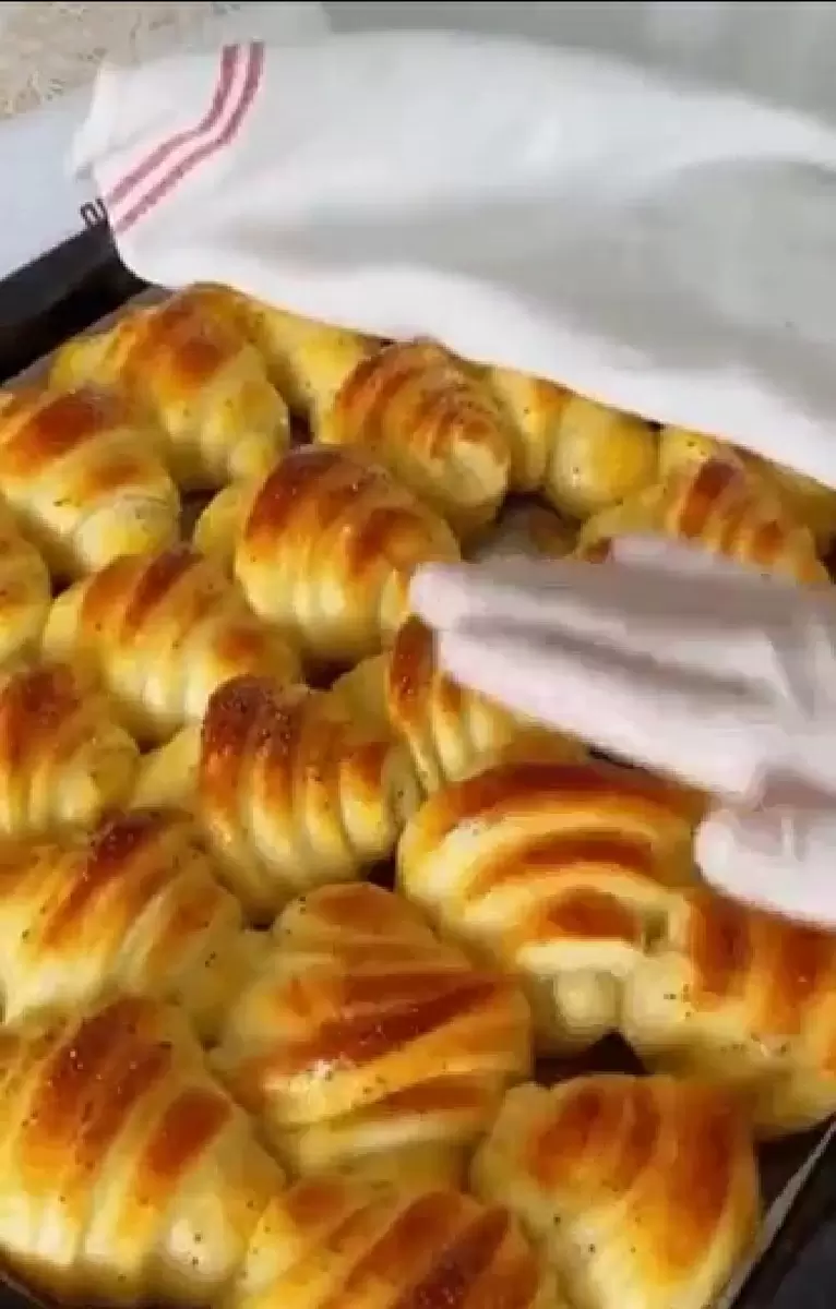 Сухие дрожжи — 1 пакет (7–10 г) Сахар — 1 столовая ложка Тёплая вода — 1 стакан (примерно 200 мл) Тёплое молоко — 1 стакан (примерно 200 мл) Соль — 1 чайная ложка Мука — 5–6 стаканов (приблизительно 650–750 г, ориентируйтесь на консистенцию теста) Сливочное масло или маргарин — 120 г (размягченное, для прослойки) Сыры на выбор (например, твёрдый сыр и моцарелла) — для начинки Яичный желток — для смазывания перед выпечкой Пошаговый процесс приготовления В глубокой миске соединить теплую воду, молоко, сахар, соль и дрожжи. Тщательно размешать до однородности. Постепенно добавляя муку, замешивать тесто, пока оно не станет мягким и не будет прилипать к рукам. Покрыть миску пленкой или полотенцем и оставить в теплом месте на 1 час, чтобы оно увеличилось в объёме вдвое. Обомните тесто и разделите его на 9 равных частей, сформировав из них небольшие шарики. Каждый шарик раскатать в круг диаметром около 20 см. Слой за слоем, смазывая маслом, укладывать их друг на друга, кроме верхнего круга. После сбора всех лепёшек в стопку, раскатайте её в больший круг — диаметром 40–45 см и аккуратно переверните, чтобы гладкая сторона оказалась сверху. Нарезать круг на равномерные сектора (примерно 16 треугольников) и в широкую часть каждого треугольника добавить немного сыра, завернув в рулет. Выложить булочки на противень, застеленный пергаментом, и смажьте взбитым желтком. Выпекать в предварительно разогретой до 180–190 °C духовке в течение 15–20 минут до золотистой корочки. Эти ароматные и мягкие булочки порадуют всех, кто их попробует. Удачной выпечки!