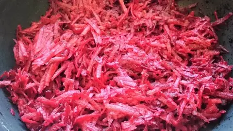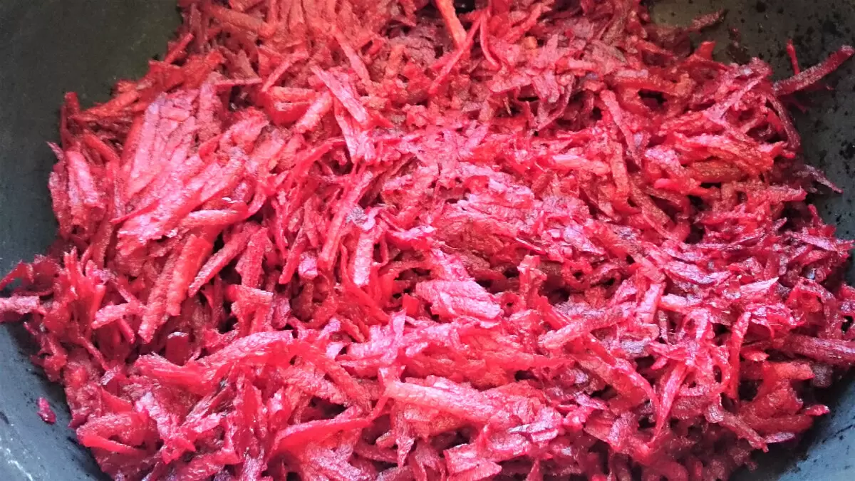 Затем к процессу добавляется свекла. Она очищается и натирается на крупной терке, а затем обжаривается в растительном масле с добавлением уксуса. Эта техника позволяет раскрыть естественный вкус свеклы и основной ингредиент блюда.