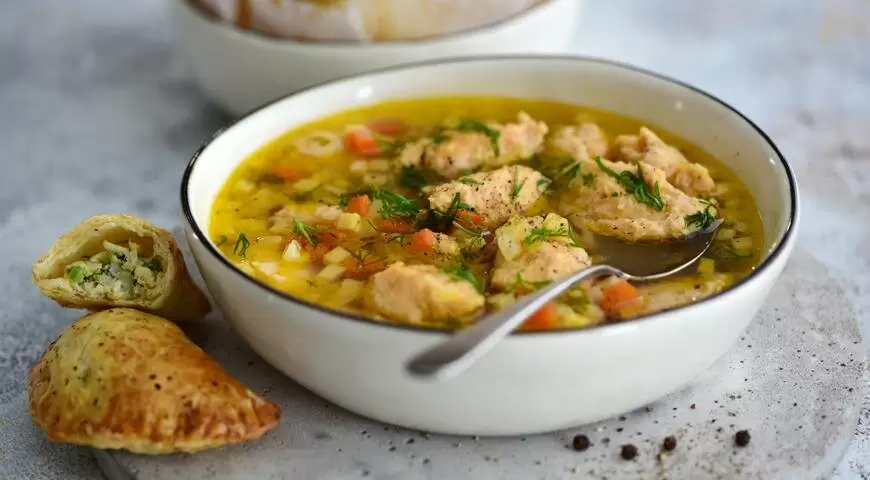 К этому блюду идеально подойдут простые пирожки из слоеного теста, которые легко приготовить с начинкой из рубленых яиц, зеленого лука, укропа и сливочного масла. Перед выпечкой стоит смазать пирожки желтком, чтобы они выглядели более аппетитно на столе.