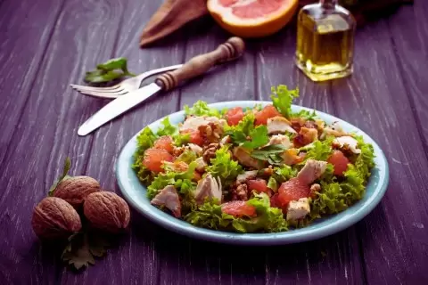 • В глубоком блюде объединить курицу, грейпфрут и грецкие орехи.