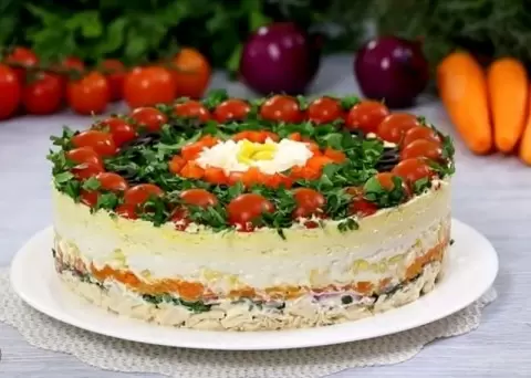Этот яркий и вкусный салат станет настоящей изюминкой на новогоднем столе, удивляя гостей непревзойденным сочетанием ингредиентов.