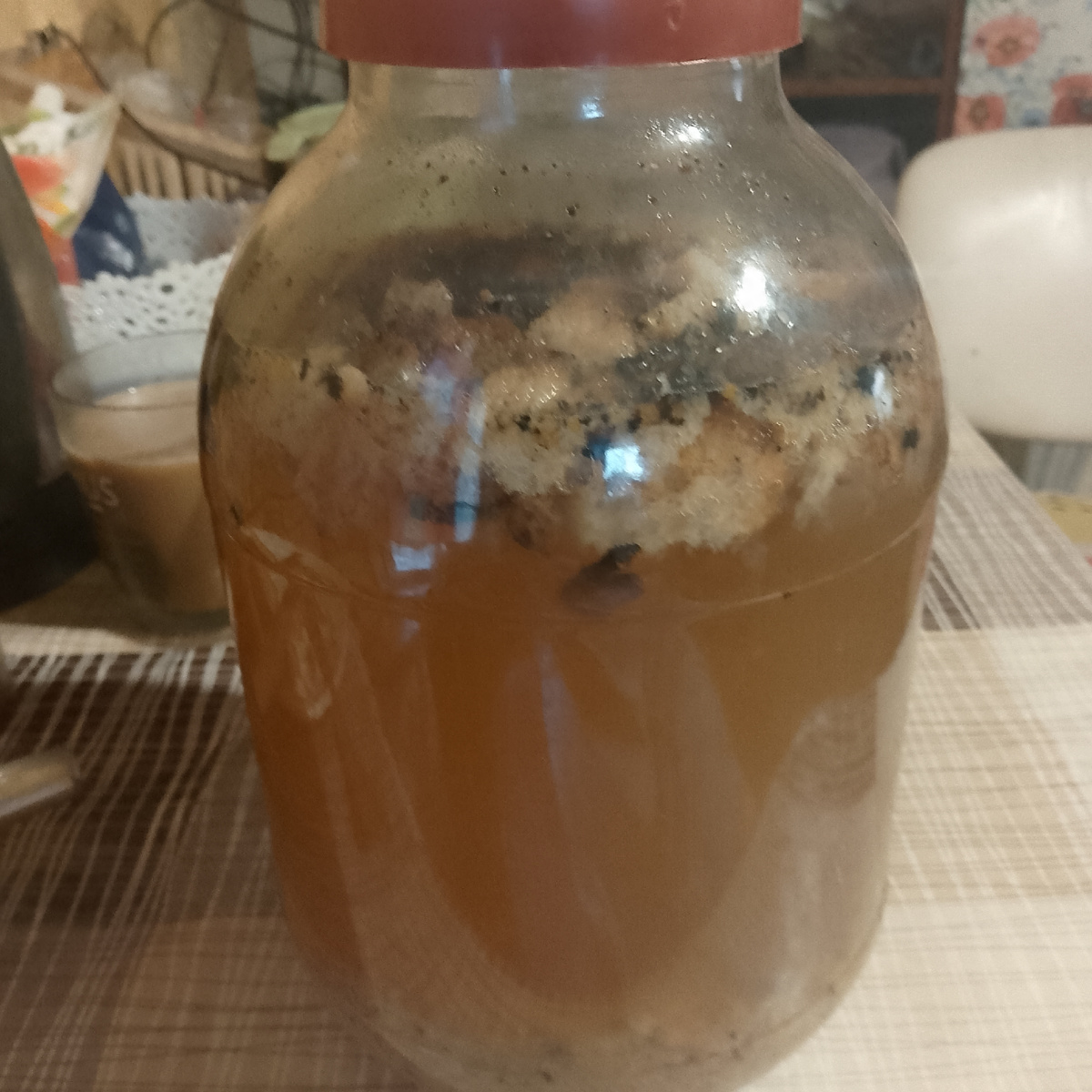 Сейчас на кухне настаивается квас: четыре банки уже готовы, а пятая — с закваской. Из таких запасов выйдет отличный напиток, а чтобы добавить хрустящести, стоит обжарить сухарики. Таким образом, можно достичь оптимального баланса вкусов.