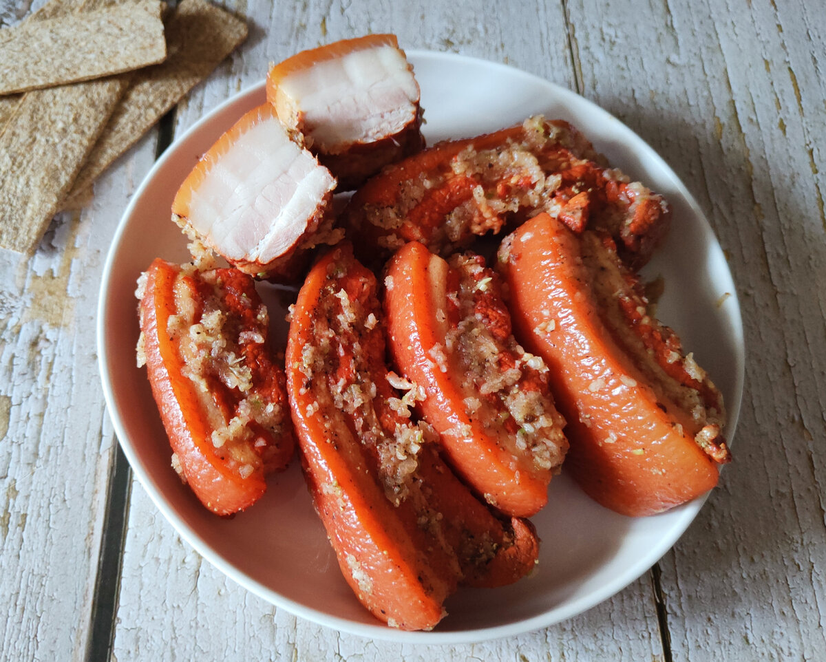 После настаивания грудинку аккуратно извлекают из рассола и обсушивают. Теперь она готова к употреблению — её можно нарезать на тонкие кусочки и подавать на стол. Если хотите усилить вкус, мясо натирается чесноком, а затем посыпается перцем.