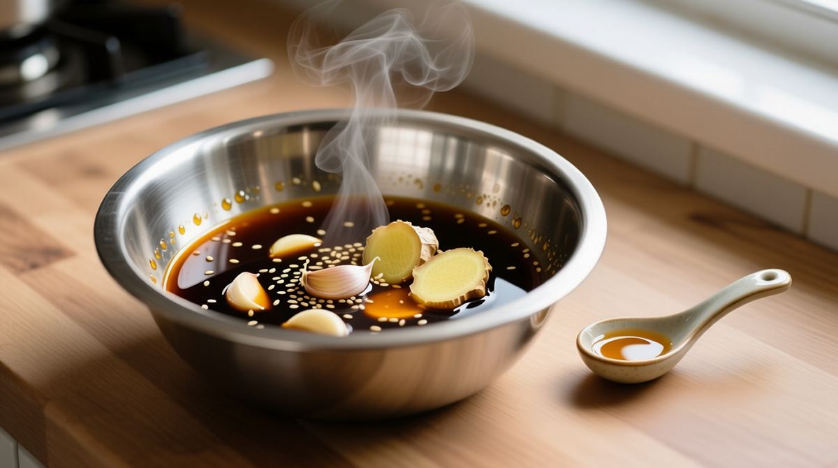 - Солёная основа: Соевый соус не только солит, но и насыщает продукт основной нотой умами, мгновенно впитываясь.