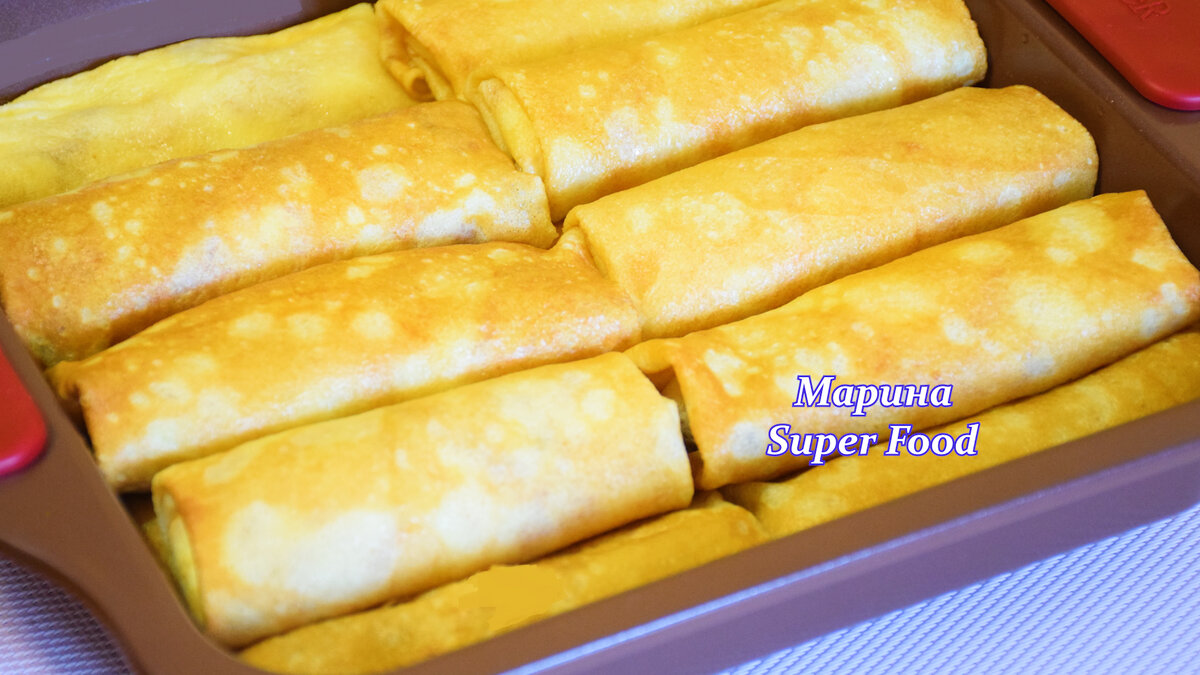 5. Запекать в заранее разогретой до 180 градусов духовке в течение 20-25 минут, накрыв фольгой. Готовые блинчики подаем горячими с чаем или кофе. Даже остывшие они остаются вкусными!