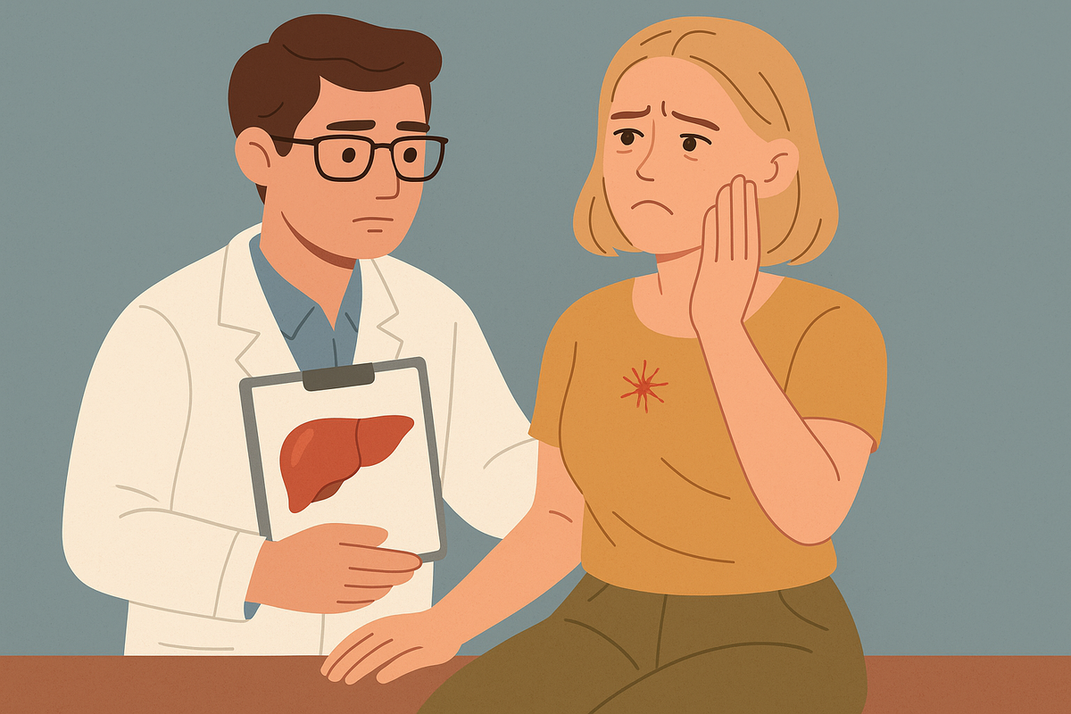 Некоторые кожные проявления, такие как акне или папилломы, не обязательно связаны с заболеваниями печени. Тем не менее, существуют специфические симптомы, например, геморрагические высыпания на голенях, которые могут указывать на васкулит, сопутствующий хроническому гепатиту С. Также одним из характерных признаков цирроза являются сосудистые звездочки, которые можно увидеть на коже — это небольшие образования с тонкими «лучиками».