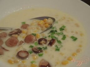 Фасоль следует замочить в холодной воде на 3-4 часа перед приготовлением.Промыть фасоль, залить её 1.5-1.75 литрами чистой холодной воды и варить на среднем огне 60-75 минут после закипания.Пока фасоль варится, нарезать колбаски мелкими кусочками. Можно использовать любой вид копчёного мяса.Мелко нарезать репчатый лук.На растительном масле обжарить колбаски в течение 3-5 минут.Добавить лук к колбаскам и обжаривать до золотистой корочки.Выложить saut? из колбасок и лука в кастрюлю с варёной фасолью и готовить ещё 5-7 минут после закипания.Добавить консервированную кукурузу, посолить и поперчить по вкусу, и варить ещё 5-7 минут.И наконец, влить сливки в суп, довести до кипения и выключить огонь.Подавайте суп суккоташ горячим, приправив свежим зелёным луком. Приятного аппетита!