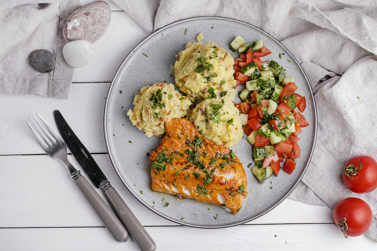 Шаг 3: Мелко нарезать помидоры и огурцы, приправить их солью, перцем и оливковым маслом. Подавайте треску с картофельным пюре и свежим овощным салатом, наслаждаясь каждым укусом.