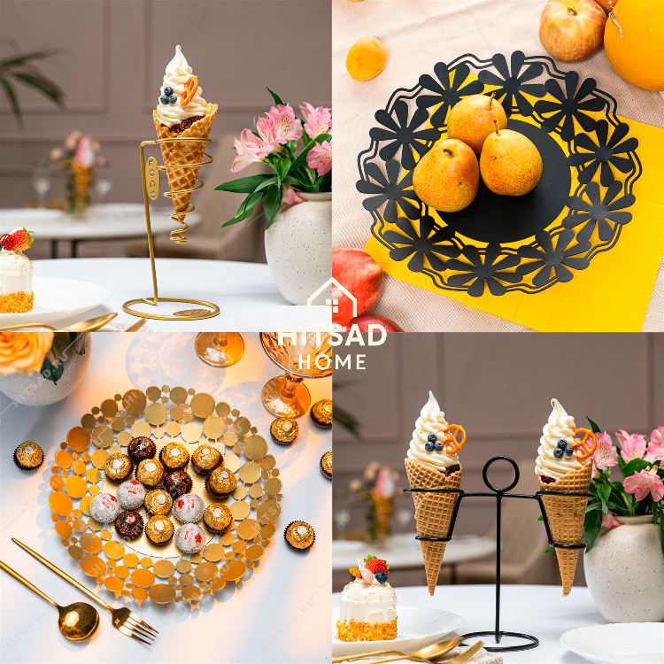 Сервировочные подставки от HiTSAD идеально подходят для тех, кто ценит домашний уют и стиль. Металлические конструкции и корзины создают атмосферу без суеты и помогают представить десерты, закуски и мороженое так, как будто это шедевры кулинарии. Их лаконичный дизайн гармонично впишется в различные стили интерьера – от современного минимализма до рустикального прованса.