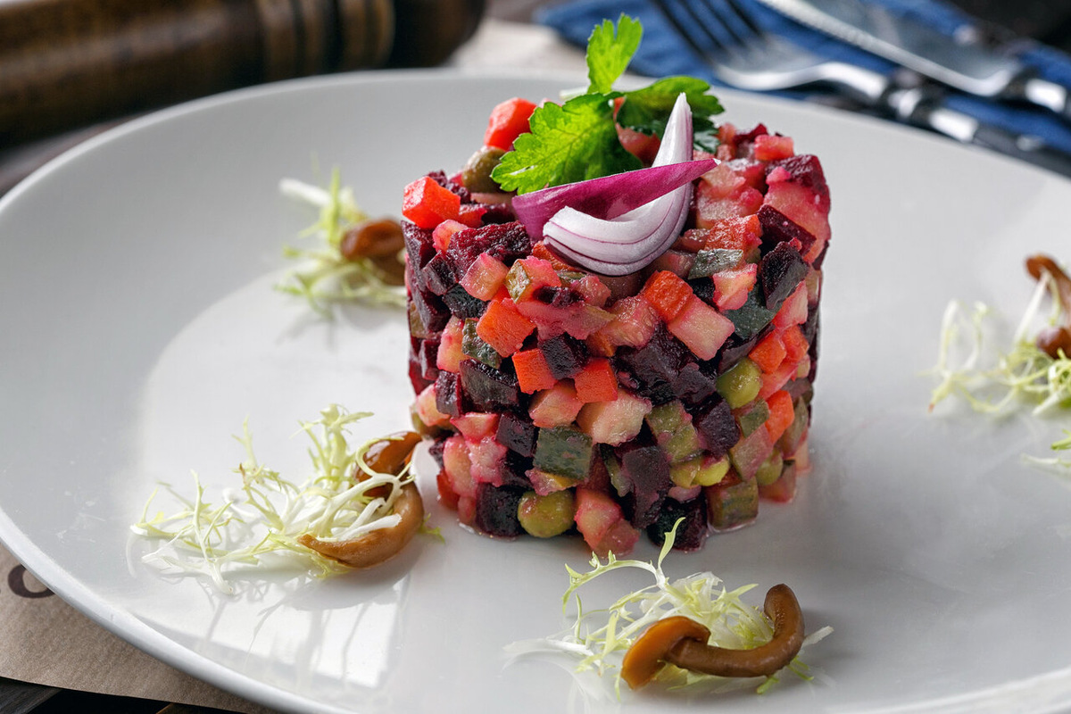 Тем временем, на плите варились свекла, морковь и картошка. Пока овощи достигали золотистой готовности, хозяин дома успел заняться уборкой, а после — нарезал отваренные ингредиенты и открыл банку маринованных огурцов. Все было достаточно просто: овощи смешивались с оливковым маслом и щепоткой соли. Винегрет практически был готов!