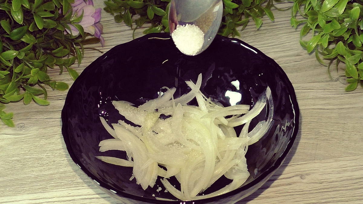 После этого добавьте в лук чайную ложку лимонного сока и заправьте растительным маслом. Хорошо перемешайте и дайте настояться.