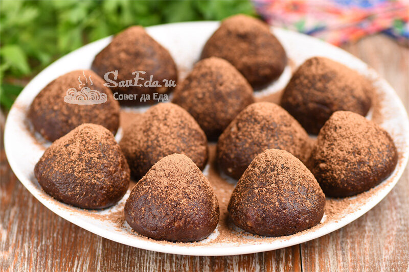 В небольшой кастрюле смешивают какао-порошок, сахар и крахмал (предпочтительно кукурузный).После тщательного перемешивания добавляют молоко и сливочное масло.Поставить на средний огонь и варить глазурь, непрерывно помешивая венчиком, около одной минуты с момента закипания. Как только глазурь загустеет, снять с огня и охладить.Грецкие орехи измельчаются в блендере и добавляются в глазурь, создавая уникальный вкус. Возможна замена орехов на другие по желанию.Аналогично измельчается сахарное печенье в блендере до состояния крошки и добавляется к смеси по частям. Кроме сахарного печенья можно использовать песочные печенья или овсяные хлопья.Полученная шоколадная масса должна быть достаточно густой, чтобы формовать из неё пирожные. Общий вес смеси около 450 г.Формируем из смеси пирожные, придавая им различную форму, например, в виде конусов. Из данной массы можно получить до 11 пирожных.Посыпаем готовые изделия какао-порошком и помещаем в холодильник на 30 минут. Охлаждение придаст десерту особую плотность, а шоколадная глазурь сделает его изумительно вкусным.Приятного аппетита!