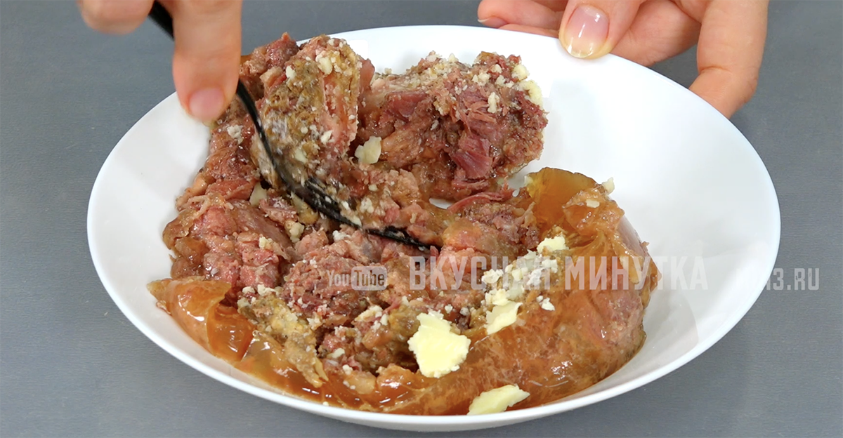 Начните с открытия банки с тушенкой. На самом деле, это самая трудная часть, ведь в ней всегда нужно найти кусочки мяса. В этом рецепте используется говяжья тушенка, но можно взять любую, которая есть под рукой.