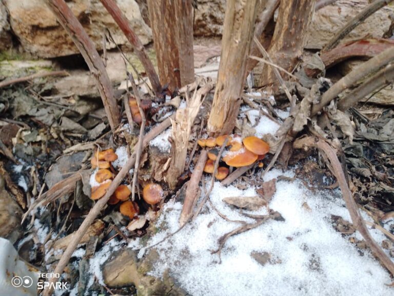 В начале месяца она наткнулась на необычную грибную семейку, расположившуюся в укромном уголке между хозяйственными постройками. По словам Натальи, это оказались зимние опята, также известные как фламмулина бархатистоножковая.