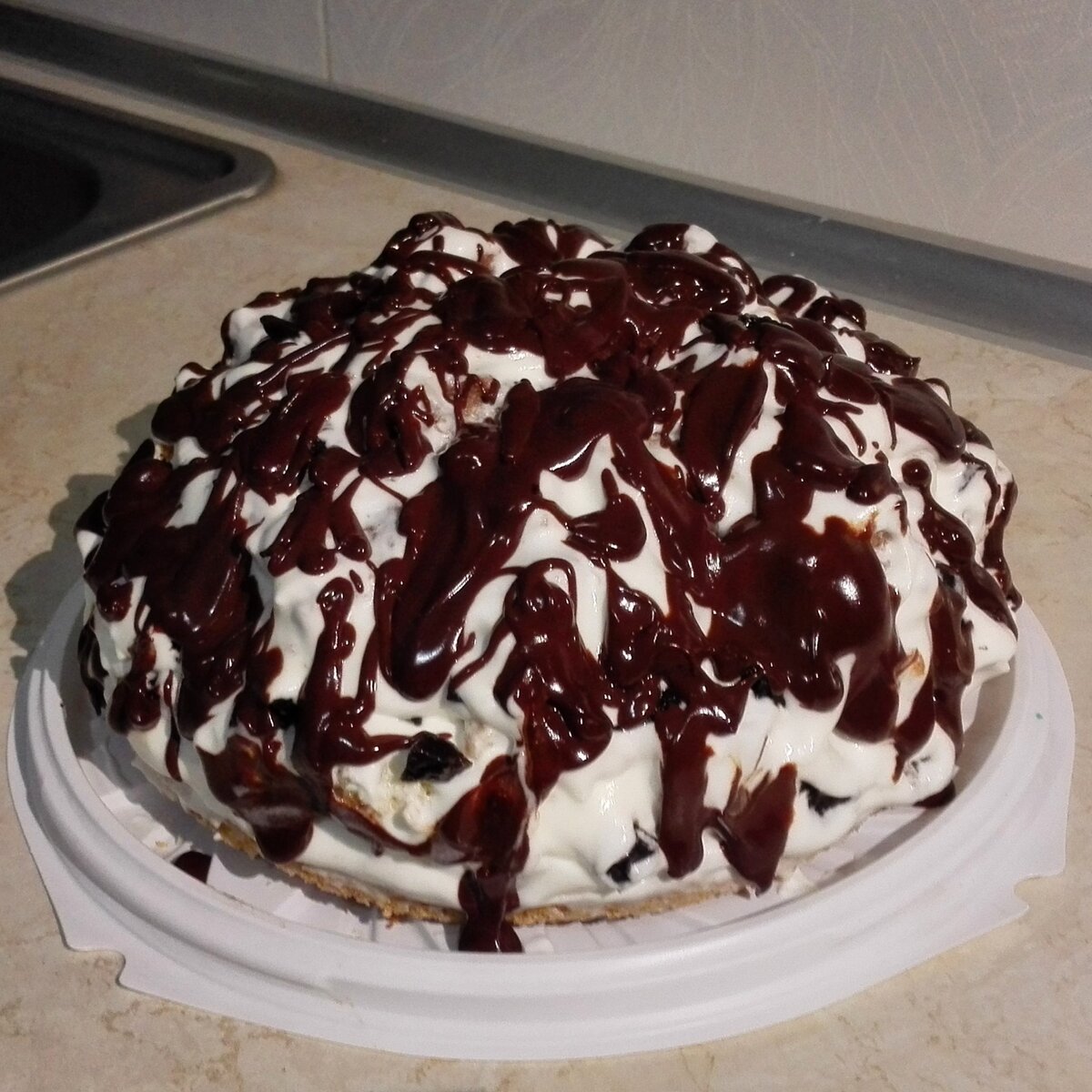 Бисквит: Взбить яйца с одним стаканом сахара до пышной массы. Добавить 250 г сметаны и тщательно перемешать. Постепенно ввести муку, консистенция должна быть однородной. После этого добавить пищевую соду или разрыхлитель. Разделить тесто на две части, в одну добавить какао. Выпекать в разогретой до 180 градусов духовке 20-30 минут, проверяя готовность с помощью зубочистки.Крем: Смешать оставшуюся сметану с 0.5 стакана сахара, взбивать до увеличения в объеме в 2 раза. Этот процесс обычно занимает около 10 минут на высокой скорости.Глазурь: На водяной бане растопить шоколад с молоком до полной однородности.Сборка торта: Разрезать светлый бисквит на 2 круга. Намазать кремом обе половины. Шоколадный корж нарезать на кубики и обмакнуть в крем, собирая их горкой на светлом корже. Полить глазурью, не дожидаясь охлаждения. Поставить торт в холодильник для пропитки на 3 часа.Дополнительно: Для обогащения вкуса можно добавить чернослив или грецкие орехи.Практический совет