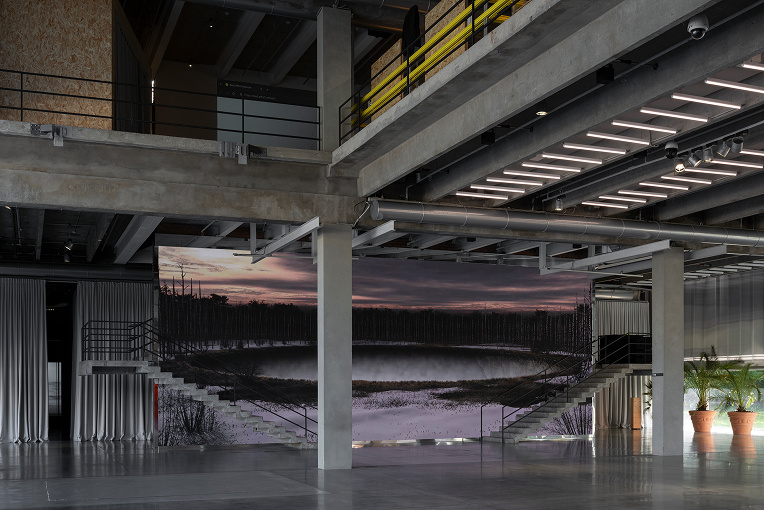 Первый видеопроект, который смогут увидеть зрители, называется «Озеро». Эта знаковая работа группы демонстрирует яркую уникальность художественного языка. С помощью 3D-графики художники создали изумительный пейзаж — круглый водоем, окруженный лесом. На первый взгляд, мир ролика кажется спокойным и статичным, однако со временем начинает происходить неожиданная трансформация: лед начинает таять, и поверхность воды открывает таинственную пропасть, меняя восприятие зрителя.
