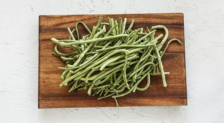 Для начала необходимо тщательно выбрать фасоль, исключив поврежденные стручки. У качественных образцов стоит обрезать концы с обоих краёв. В глубокой кастрюле доведите до кипения два литра подсоленной воды и аккуратно опустите фасоль. Варите её две минуты после повторного закипания и затем процедите.