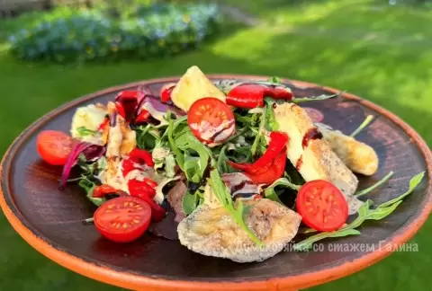 - Рукола, помидоры черри, запечённые перцы — для подачи