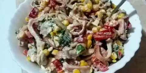 Кроме грибов, в этот салат включаются еще пять ключевых ингредиентов с заправкой. Важно помнить, что кальмары должны составлять основную часть блюда!