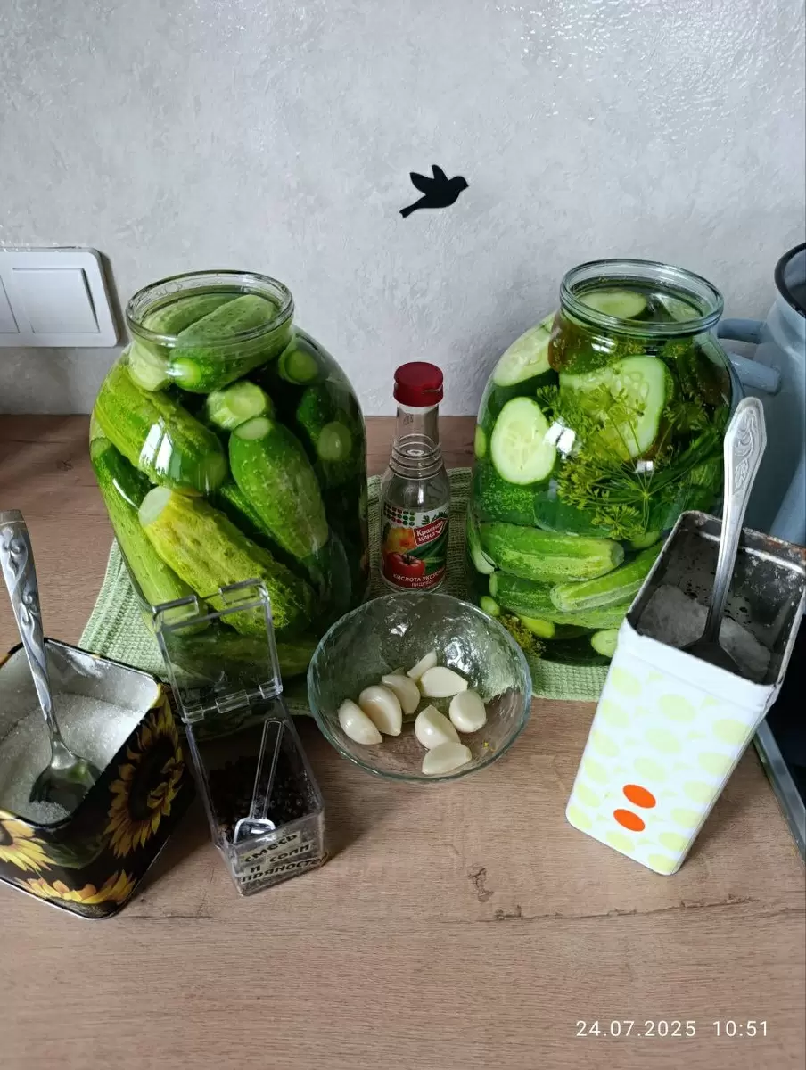 Недавно на одной из дач началась пора заготовок: открыта охота на свежие огурцы! С удовольствием были закатаны две банки с маринованными овощами. В такой совместной работе есть что-то особенно прекрасное — один человек готовит, другой закатывает. Слаженная работа всегда приводит к отличным результатам!