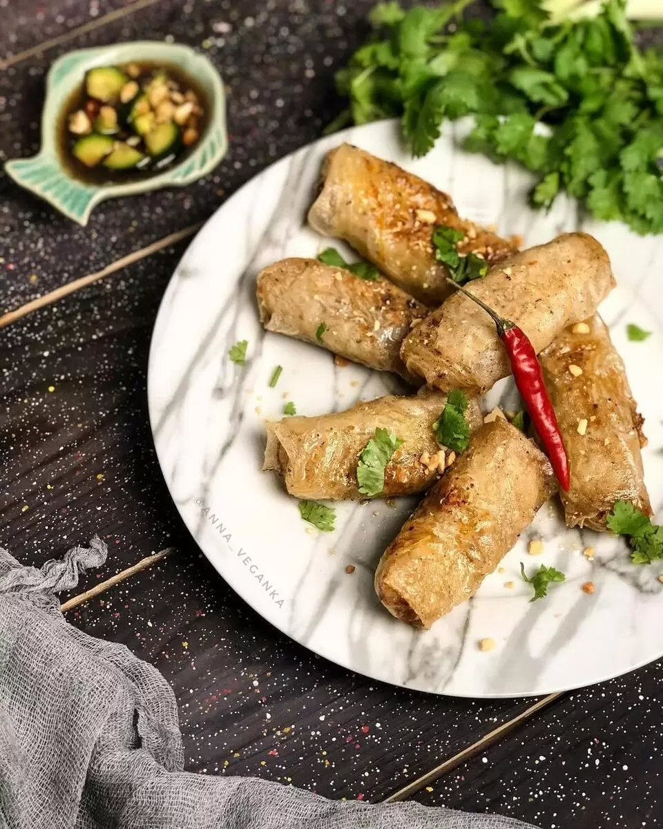 Вьетнамские блинчики в рисовой бумаге, наполненные фунчозой и шиитаке, представляют собой замечательную теплую закуску или легкий ужин в азиатском стиле. Эти рулетики хрустящие снаружи и сочные внутри, на 100% растительные, подходят как для веганского меню, так и для поста.