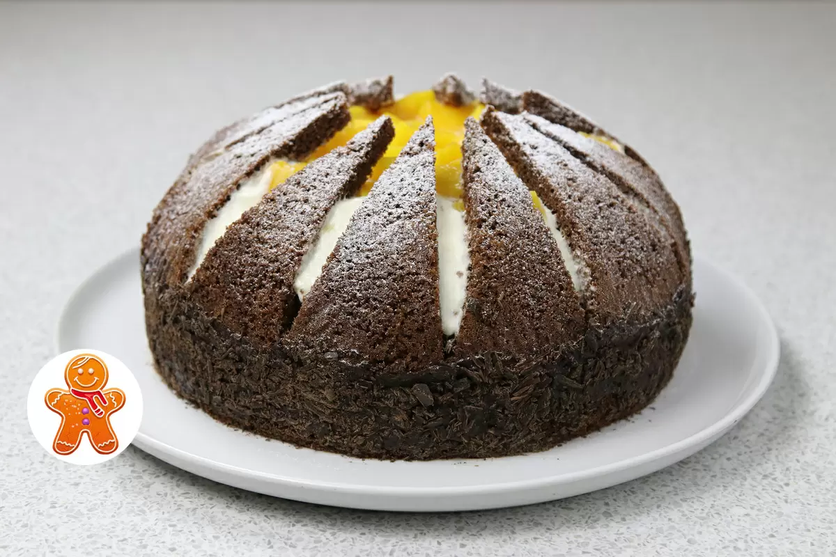 Торт оставляют в холодильнике, чтобы он хорошо застыл, а перед подачей посыпают сахарной пудрой для красивого завершения.