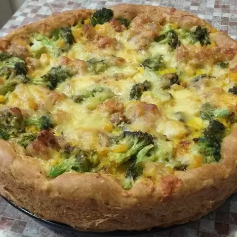 Теперь время переходить к начинке. Купаты нужно очистить от оболочки и нарезать небольшими кусочками. Брокколи разделите на мелкие соцветия. На разогретой сковороде с растительным маслом обжаривайте купаты в течение 5 минут, затем добавьте брокколи и готовьте еще 5-7 минут. Переложите обжаренные ингредиенты в глубокую емкость, добавьте кукурузу, натертый сыр, яйца и специи. Все тщательно перемешайте.