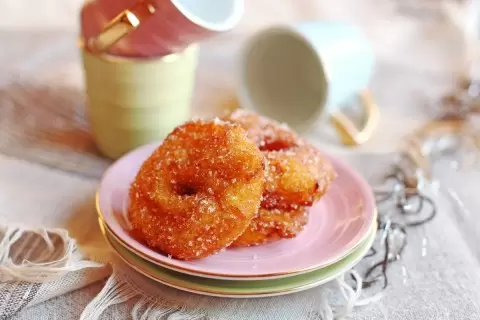 Ингредиенты: 250 г варёной тыквы, 125 г муки, немного бульона from тыквы, 1,5 столовой ложки сахара, 5 г свежих дрожжей (или 2 г сухих), щепотка соли, щепотка корицы, мускатного ореха и гвоздики. Приготовление: пюрируйте тыкву до однородности, соедините с остальными компонентами. Тесто должно держаться как на оладьи. Отдых теста до подъема, после чего формируйте небольшие шарики с отверстием посередине и жарьте во фритюре до румяности. Готовые пончики обваляйте в сахаре и подавайте. Приятного аппетита!