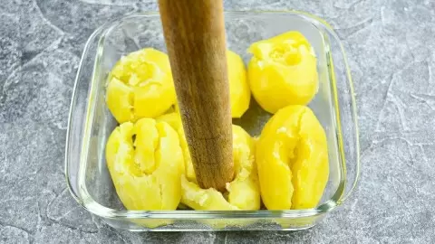 6. Отправьте форму в разогретую до 200 градусов духовку и готовьте 20 минут. За это время картофель станет мягким, масло растает, а сыр – расплавится.