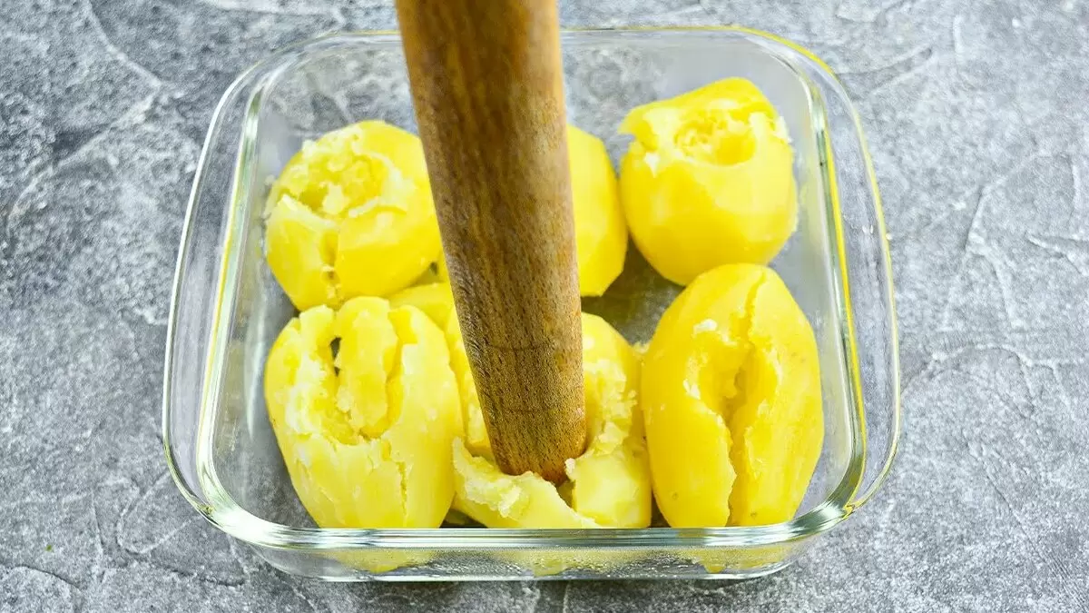 4. Готовый картофель выкладываем в форму для запекания. Дайте ему немного остыть, затем с помощью скалки сделайте небольшие углубления в каждом гнезде.