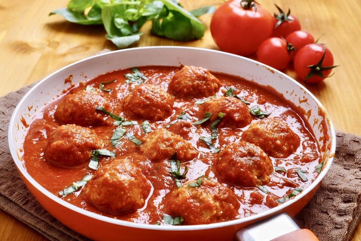 4. Сформировать тефтели желаемого размера. На сковороде, смазанной растительным маслом, разместить тефтели и залить их томатным соусом так, чтобы он дошел до середины. Накрыть крышкой и тушить на медленном огне около 20–25 минут.