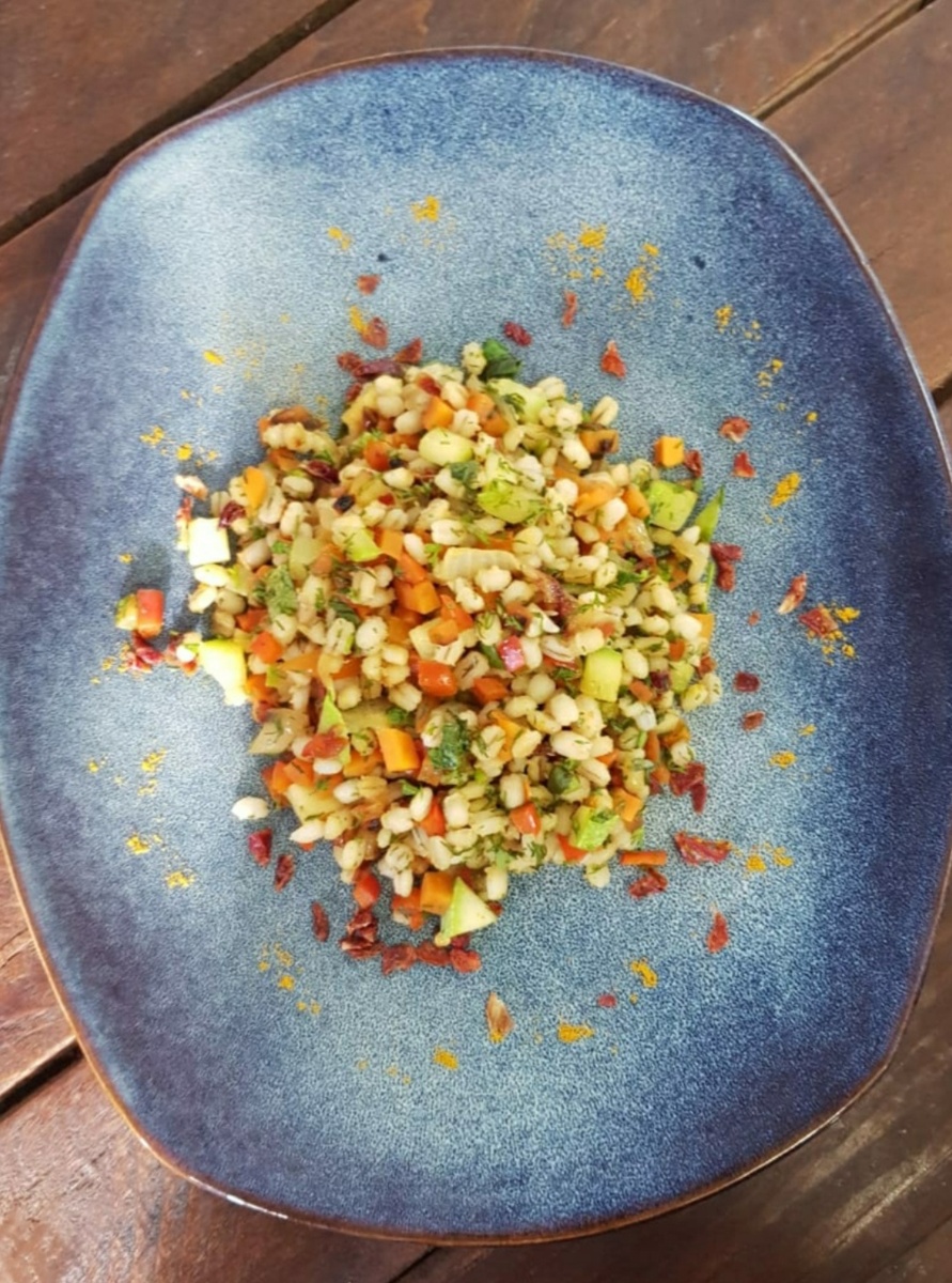 Тем временем, все овощи очистить и нарезать кубиками. Обжарить на растительном масле с добавлением куркумы, после чего добавить полбу, обжаренные лук и морковь. Не забудьте посолить и поперчить. Подавайте с рубленой зеленью. Для разнообразия в блюдо можно добавить консервированный зеленый горошек, фасоль или томаты.
