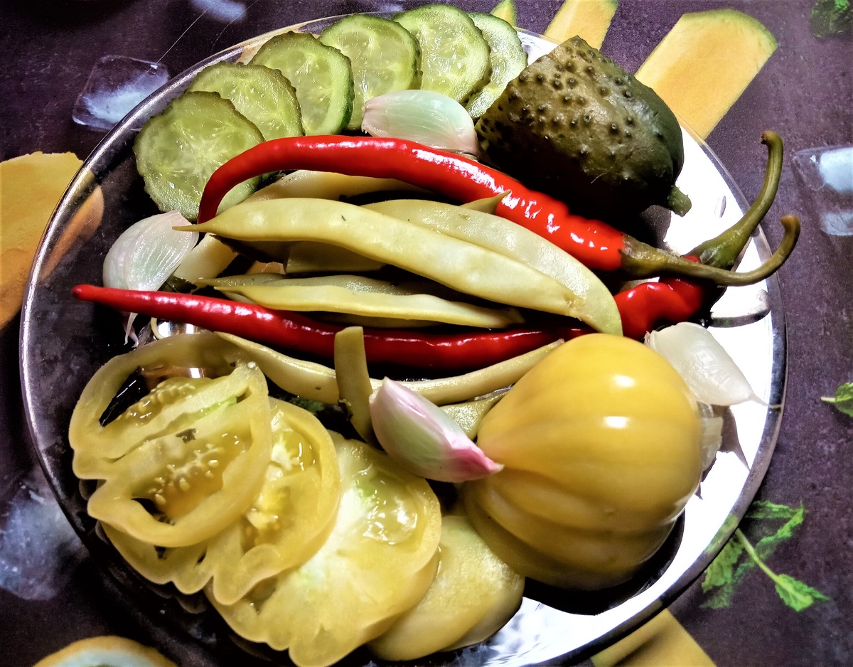 - Основные овощи: выбирайте по своему вкусу, сюда подойдут зеленые помидоры, сладкие и острые перцы, мелкие кабачки, огурцы и даже стручки фасоли.