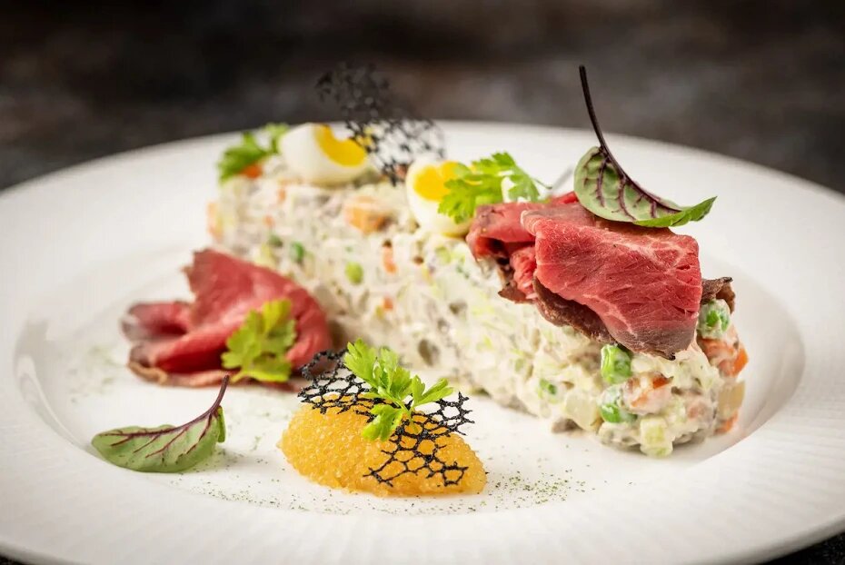 4. Для элегантной подачи используйте прямоугольную или круглую форму — это придаст блюду эстетичный вид. Выкладывайте салат на тарелку, сверху разместите половинки перепелиного яйца и кусочки ростбифа.